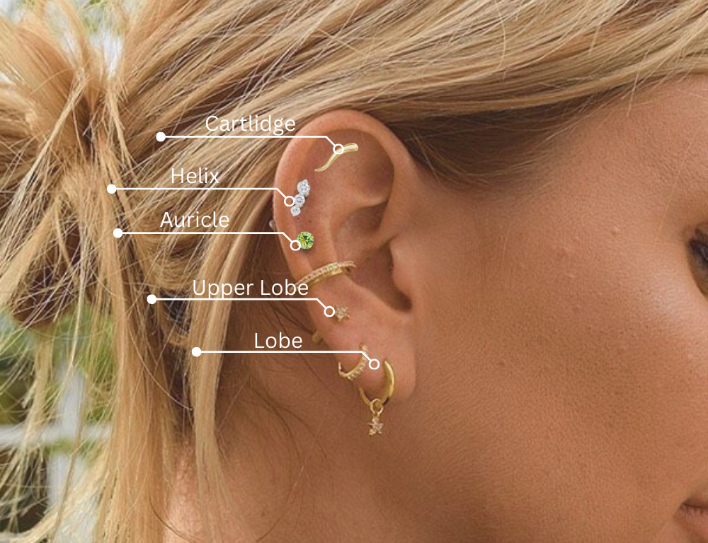 We pierce along the outer edge of your ear, including the lobe, auricle, and cartilage.